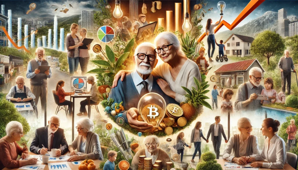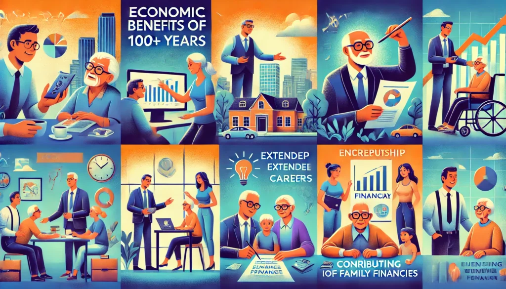 A vibrant visualization of the economic benefits of living 100+ years, highlighting extended careers, entrepreneurship, financial planning, and the contributions of seniors to families, workplaces, and society