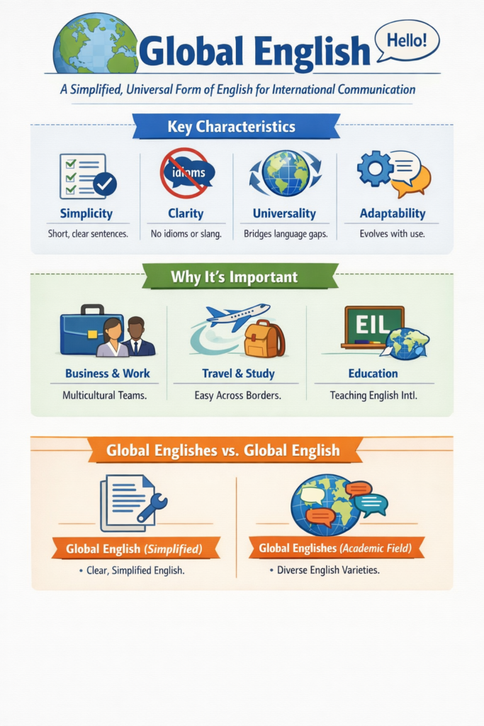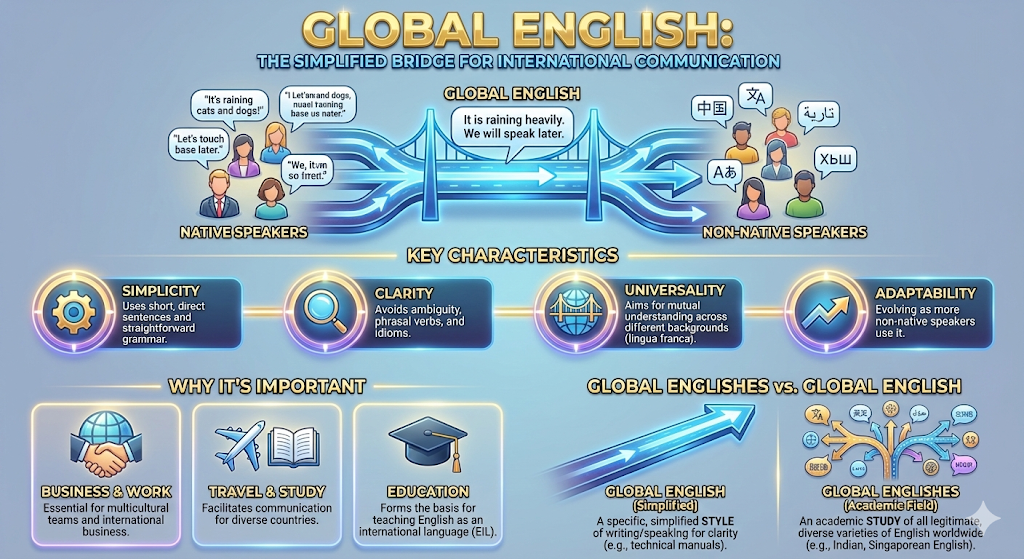 Global English refers to a simplified, universally understandable version of English, stripped of complex idioms, slang, and nuances, used for clear international communication between native and non-native speakers in business, travel, and study; it focuses on simple sentence structure, directness, and clarity to bridge cultural gaps, differing from regional varieties like British or American English by prioritizing comprehension over native conventions.