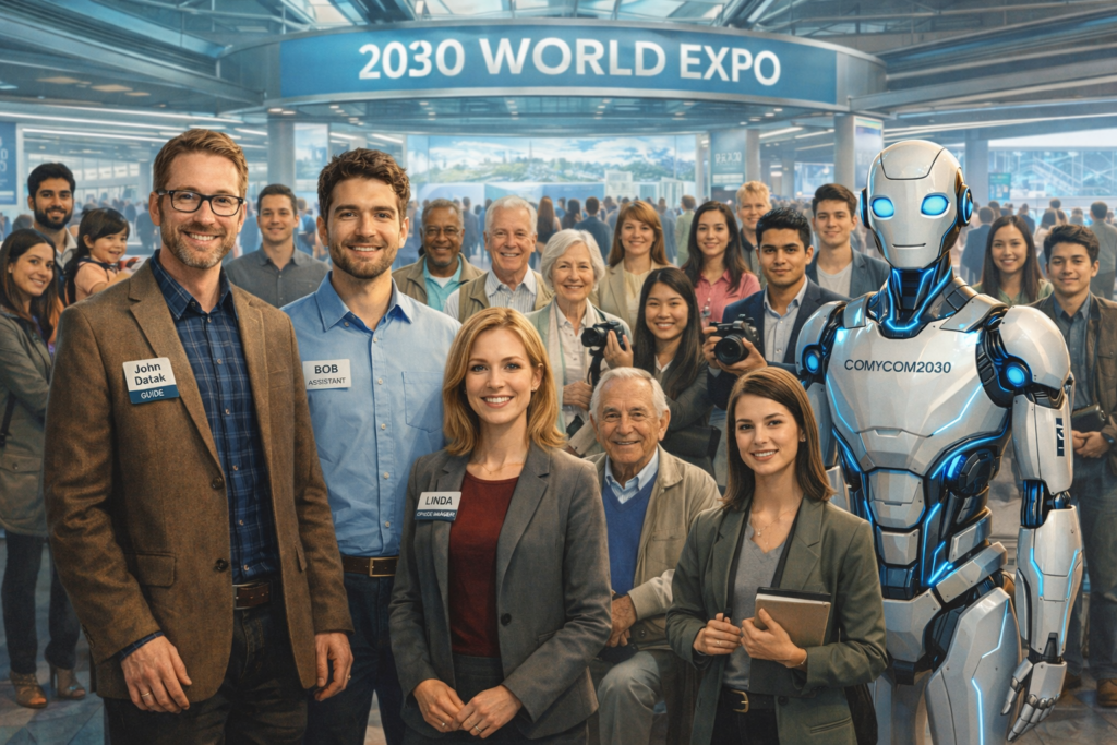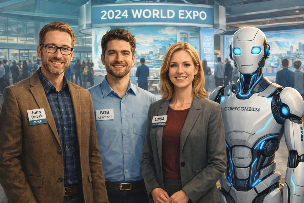I’m John Datak, your librarian and exhibition tour guide for this visit. And this is my assistant, Bob; our office manager, Linda; and our new and advanced Robot, Comycom2024. We aim to help you find the best 100 products and services, plus the best 100 informative questions and answers of the information age, at the 2024 World Expo.