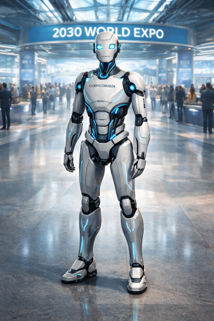 “The advanced robot, Comycom2050, possesses a comprehensive record of its experiences and memory of the past 50 years, functioning as an audio-visual recorder. It is proficient in displaying maps, images, videos, and holograms in any location. It is also connected to most smartphones, tablets, laptops, desktops, supercomputers, libraries, and Wikipedia, which contains over 100 million articles. Fluent in more than 100 languages, Comycom2024 is capable of working with many machines, driving most vehicles, and collaborating with other robots to provide a wide range of services to visitors.