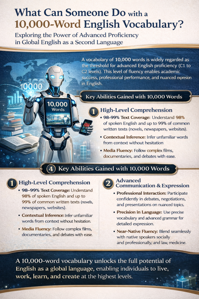 A vocabulary of 10,000 words is widely regarded as the threshold for advanced English proficiency. At this prestigious stage, a learner transcends “survival” communication and achieves high-level fluency, enabling academic, professional work or business, and social interactions with complex English expressions.