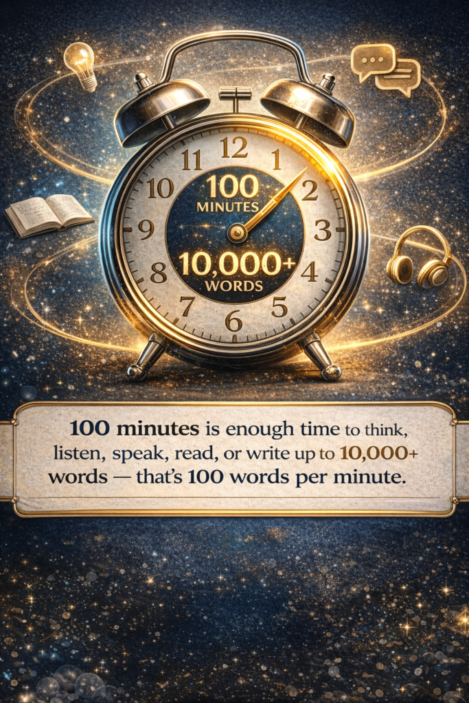 100 minutes is enough time to think, listen, speak, read, or write up to 10,000+ words — that’s 100 words per minute.