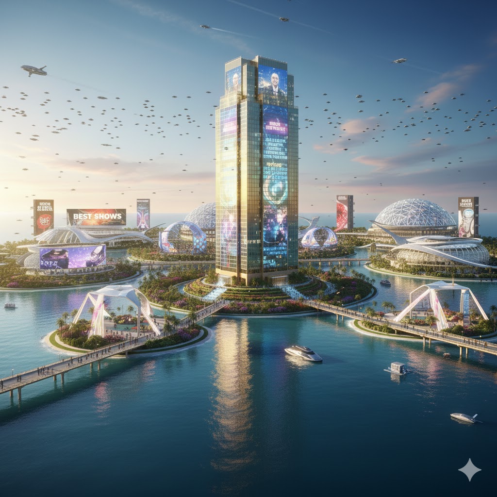 On top of a brilliant, 100-story, Golden-Glass High-Rise is a large Shakespear Global Theater, and on top of the globe large, around 10-meter, beautiful, golden, and shiny statue of William Shakespeare