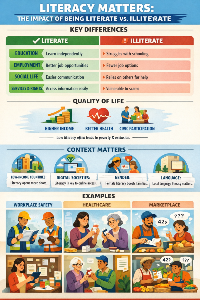 | Area | Literate (typical advantages) | Illiterate (common barriers) |