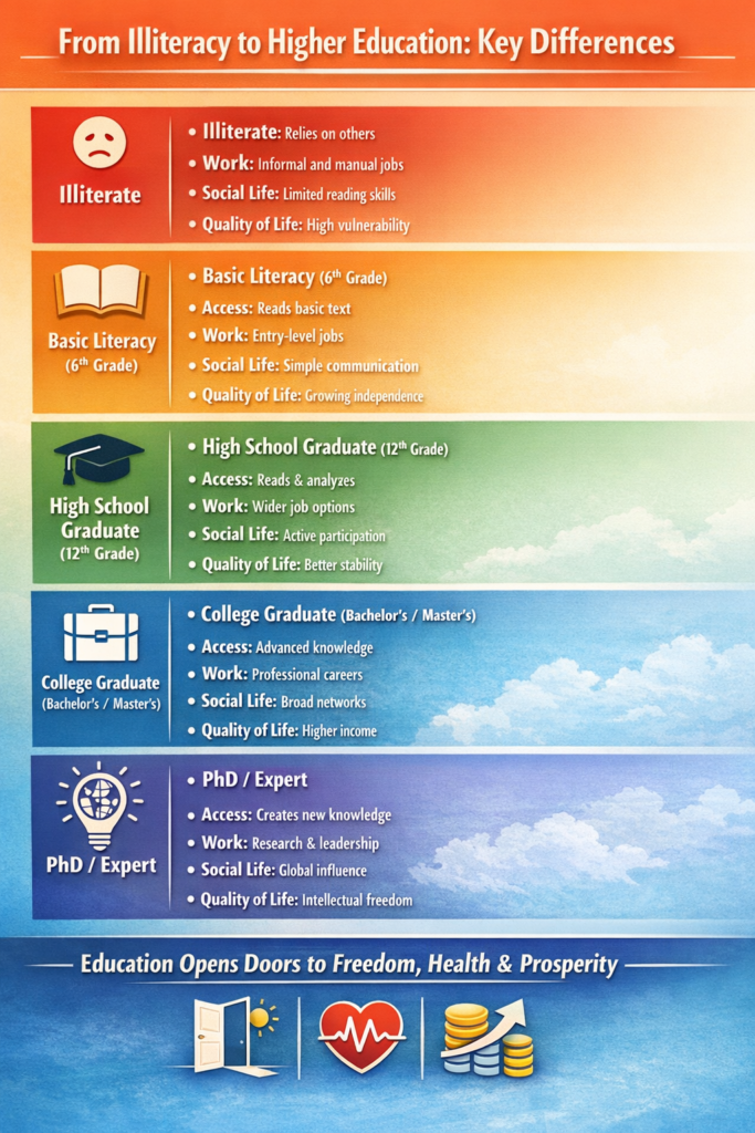 The benefits, advantages, and reasons for progressing from illiteracy to various educational levels—such as 6th grade, 12th grade, a master’s degree, and a PhD—can be abundant.