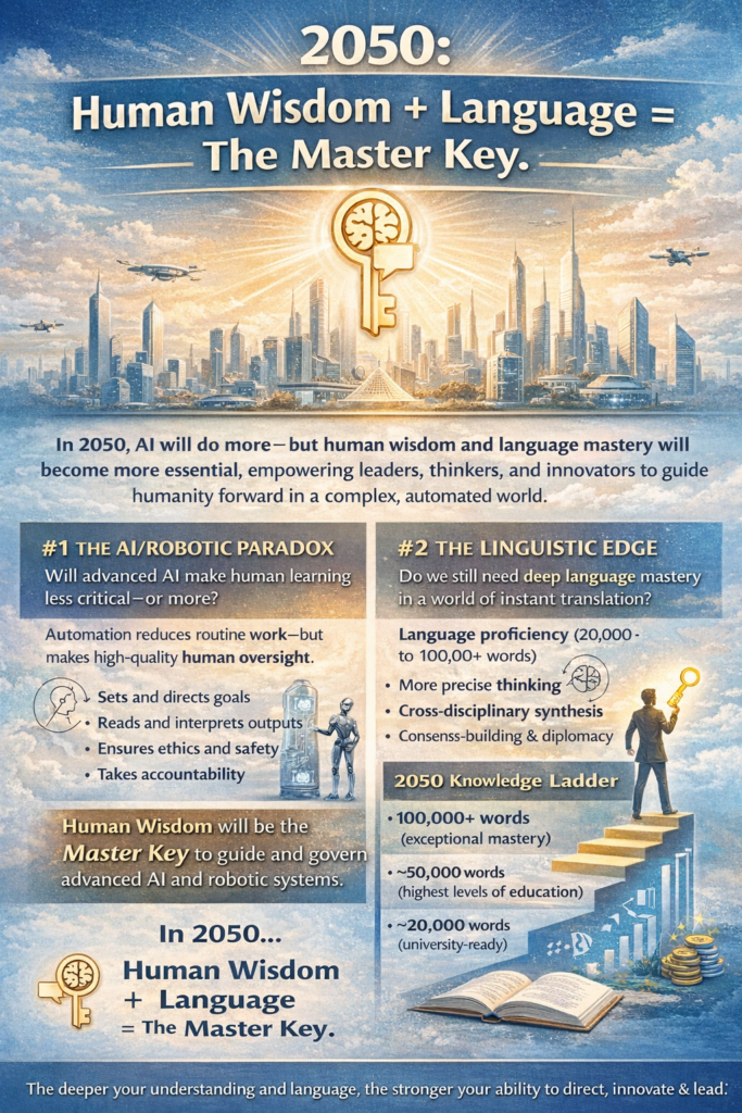 In 2050, machines will do more—so humans must understand more. Language mastery remains the master tool: it shapes thought, guides systems, and leads civilization forward.