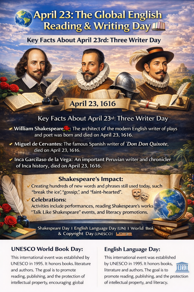 - Connections: The day explicitly ties into Shakespeare’s birthday and legacy. It also shares the date with UNESCO’s World Book and Copyright Day, World Book Night (UK/Ireland), Canada Book Day, and the UN’s English Language Day, placing it within a broader context of celebrating literature and language.