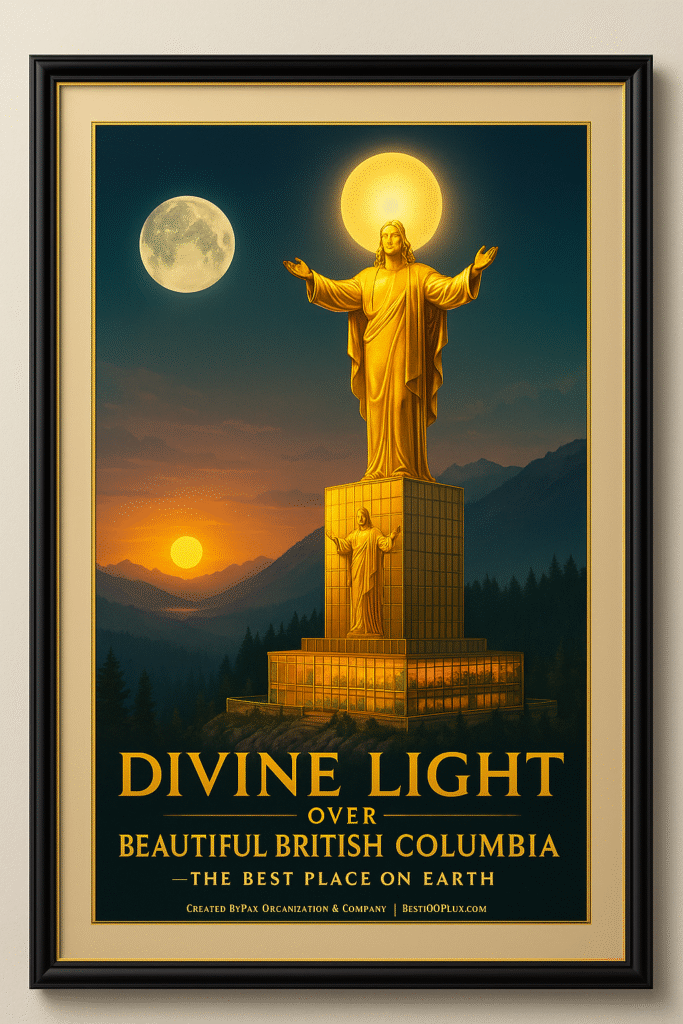 A majestic statue of Jesus, the Sun of God, stands with open, prayerful hands—welcoming everyone into His Love, His light, His way, and His truth, creating a vision of spiritual guidance, peace, hope, and unity.