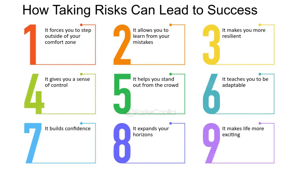 - Accomplishment and confidence: Successfully navigating a risk builds self-esteem and a sense of pride. This applies to both personal challenges, like public speaking, and professional ones.
